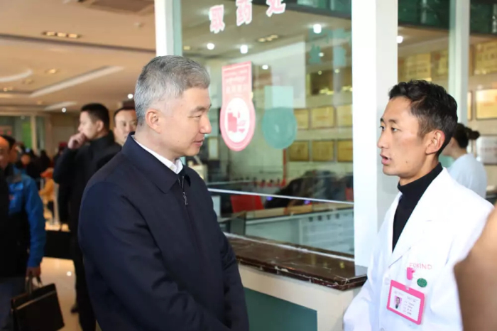 在阜康婦產兒童分院藥房,莊嚴書記與今年剛畢業參加工作的大學生次巴多吉親切交談,詳細詢問次巴多吉的所學專業、工作時間,當聽到次巴多吉說現在每個月能有7000多元收入的時候,莊嚴書記非常高興,說阜康在西藏是很有知名度的民營企業,選擇在這里工作是正確的。