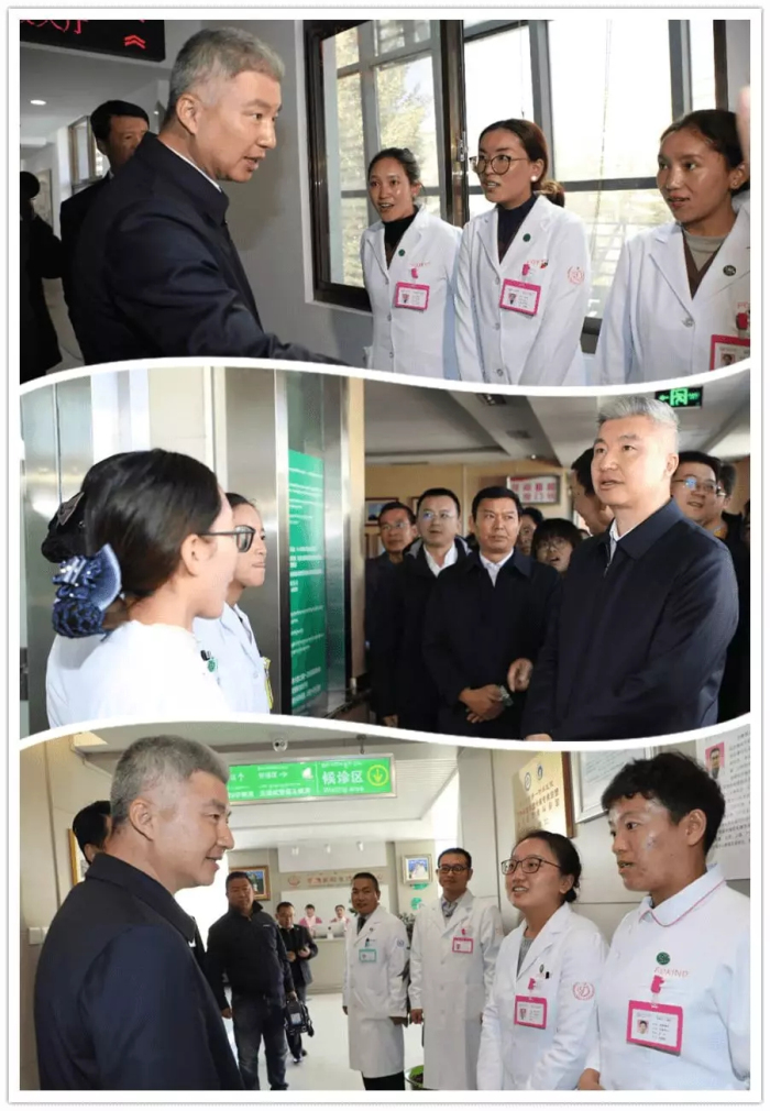 在婦產兒童分院兒科、檢驗科、生殖醫學中心,莊嚴書記和來自日喀則、山南等地市的醫護專業大學生親切交談,當得知工作一年的檢驗科旦增卓嘎一個月能收入12000元時,莊嚴書記笑出了聲,說你們收入很高啊!并對他們在阜康醫院的工作、收入情況表示滿意。