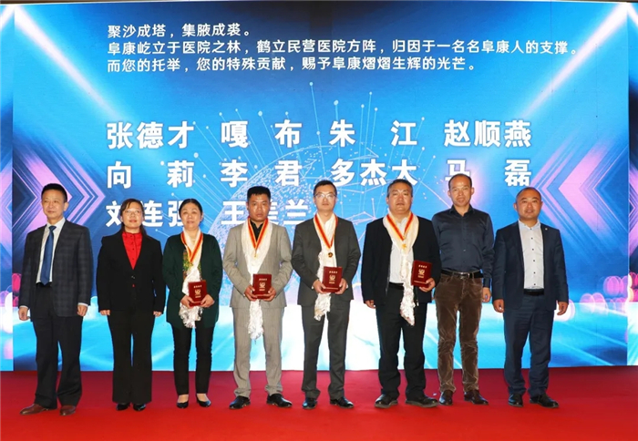 大會第三項,在公司成立22周年暨阜康醫院成立16周年之際,特頒發阜康功勛獎章3枚(每枚黃金100克)、阜康特殊貢獻獎章21枚(每枚黃金50克)、阜康無私援助獎章21枚(每枚黃金50克),向阜康做出卓越貢獻、突出貢獻和無私援助的同仁和友人致敬和感恩。