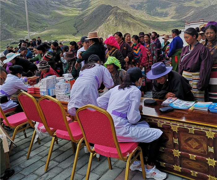 當天上午,全國婦聯宣傳部、自治區婦聯、拉薩市婦聯、那曲市婦聯一行來到安置點為群眾贈送了藏漢雙語書籍。阜康義診工作隊也來到現場為安置點居民量血壓、檢查病情并詢問身體情況,耐心細致地為群眾分析病情、講解日常衛生保健、合理用藥等衛生常識,認真解答關于常見病、多發病的預防診治及愈后注意事項。僅一個上午時間就為100余名安置點群眾開展了問診、聽診、答疑、測血壓和健康知識宣傳,免費發放各類藥品價值4萬余元 。